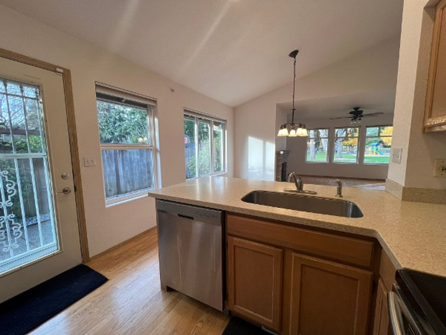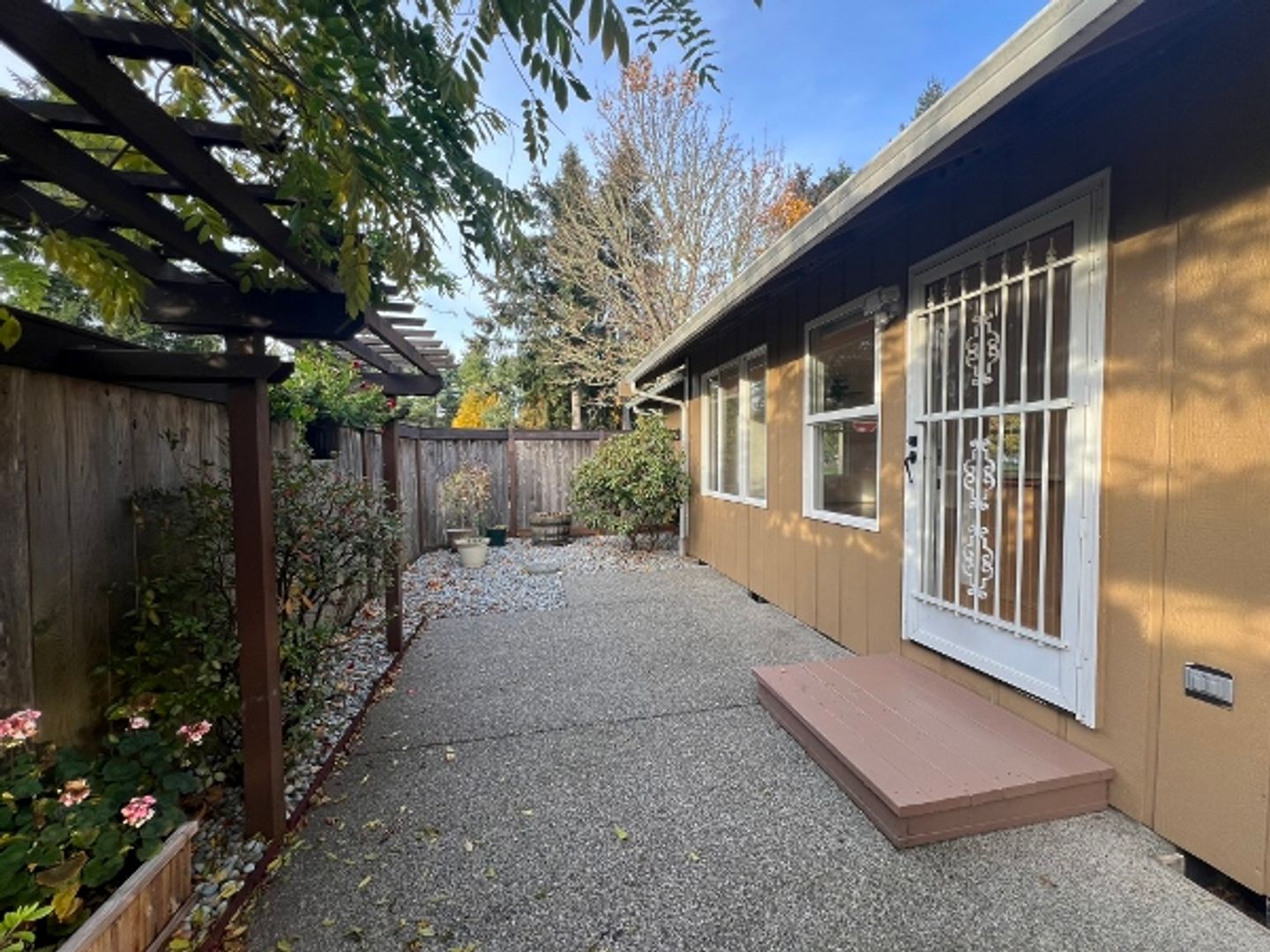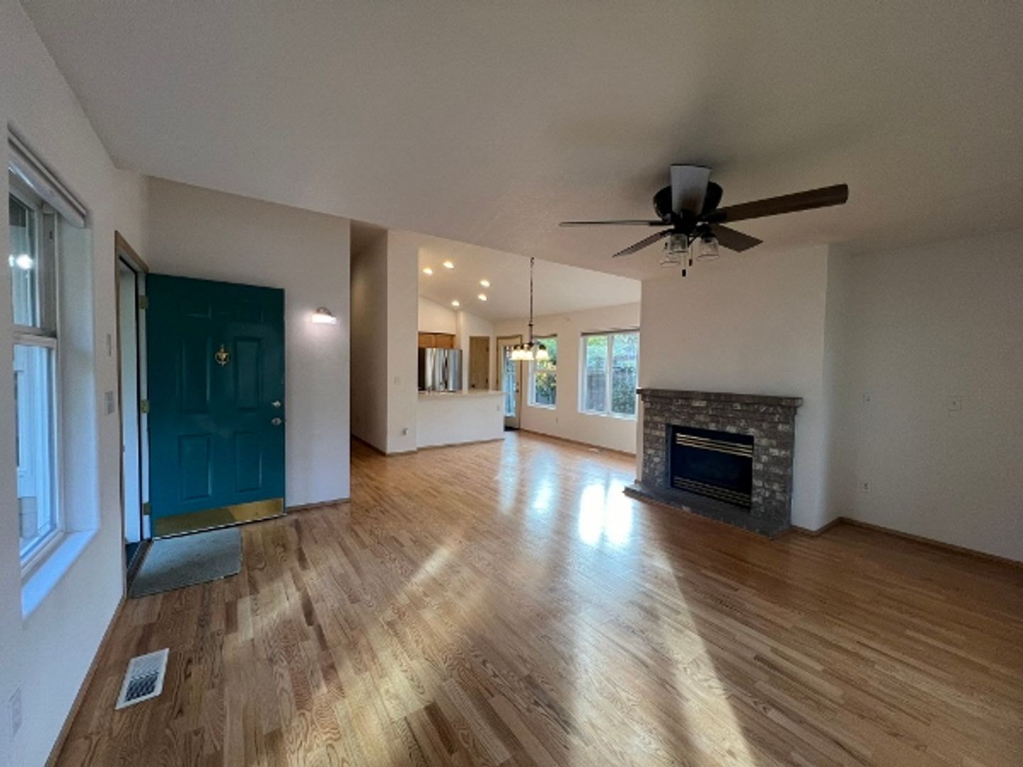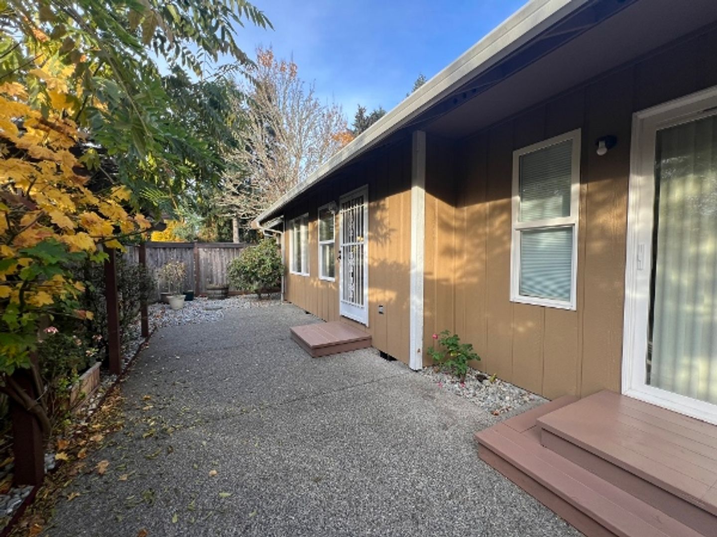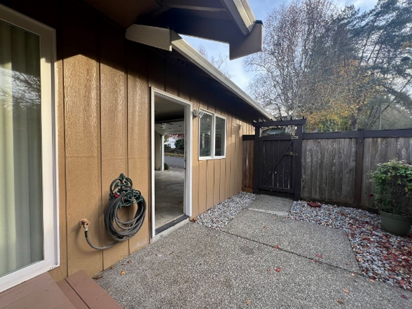 This 2 BD, 2 BA, 1,100 SF rambler is conveniently located near amenities and directly across the street from William A. Bush Park. Open living/kitchen/dining with gas fireplace and many windows. Kitchen appliances include: Refrig, electric range, microwave, and dishwasher. Primary bedroom offers double closets, attached bath, and slider. Additional bedroom and 2nd full bath. Side door and slider lead to fully fenced patio and access to garage. Washer/dryer in garage (appliances included). Attic storage accessible by ladder. Forced air heat and AC. Tenant to maintain all utilities and side yard. HOA maintains front yard. Pets allowed with homeowner approval only.