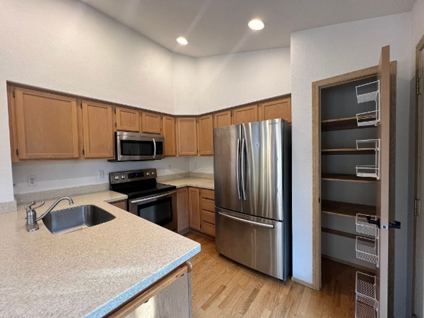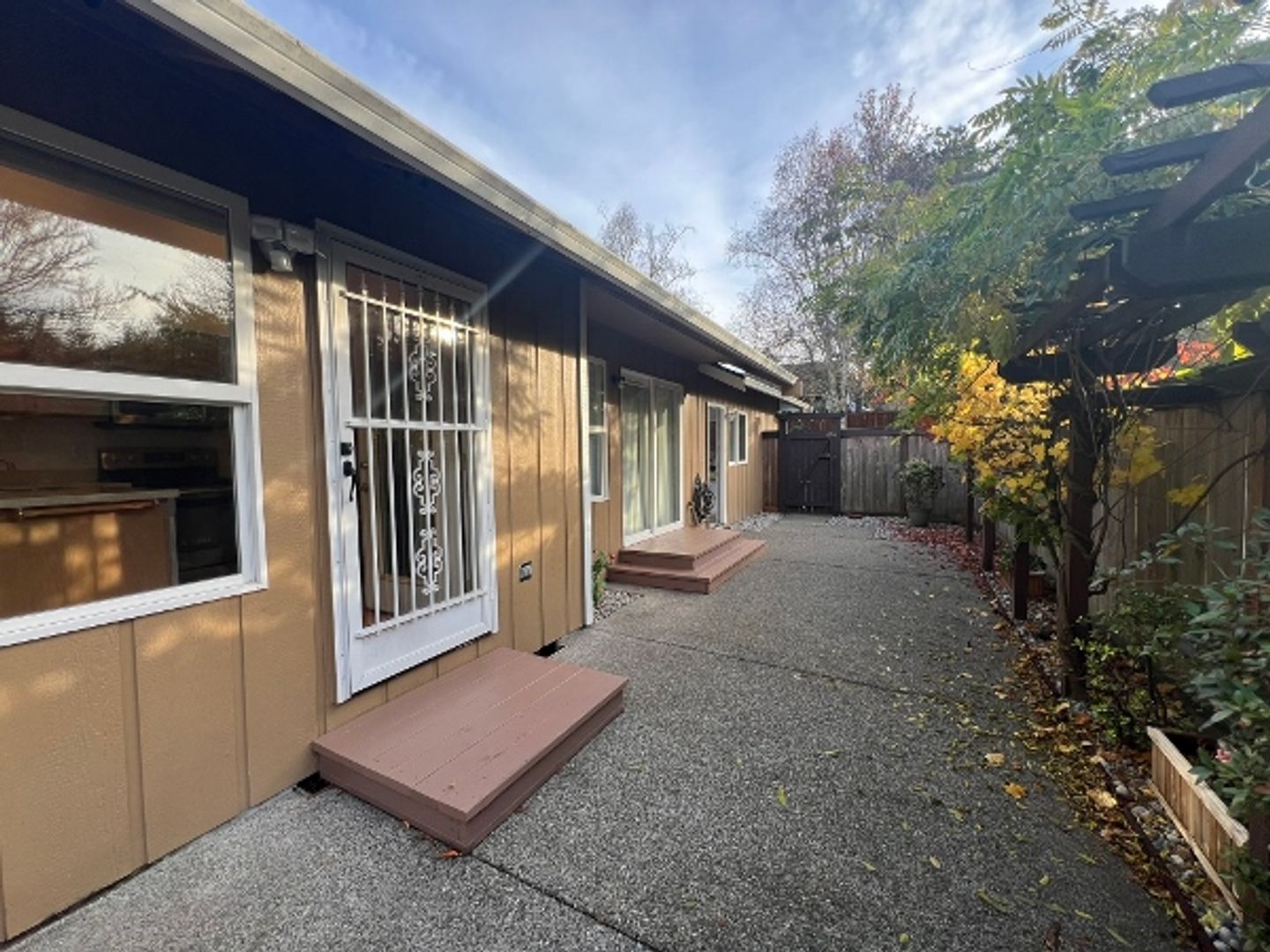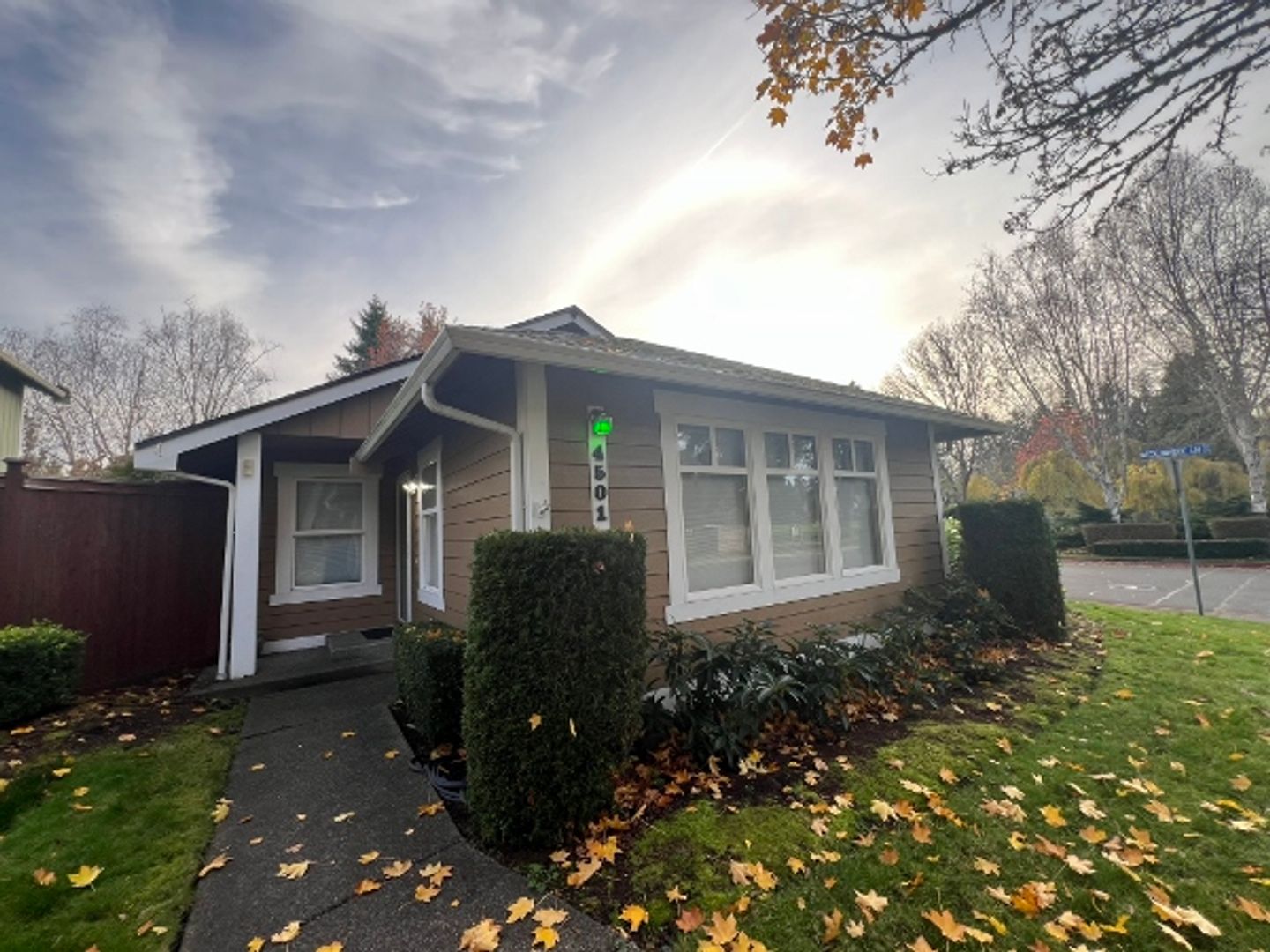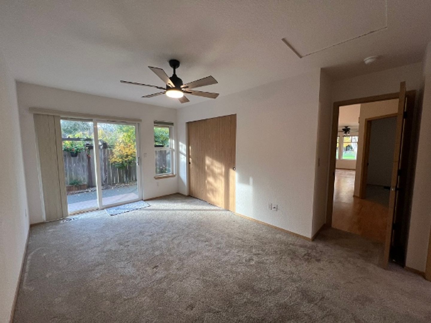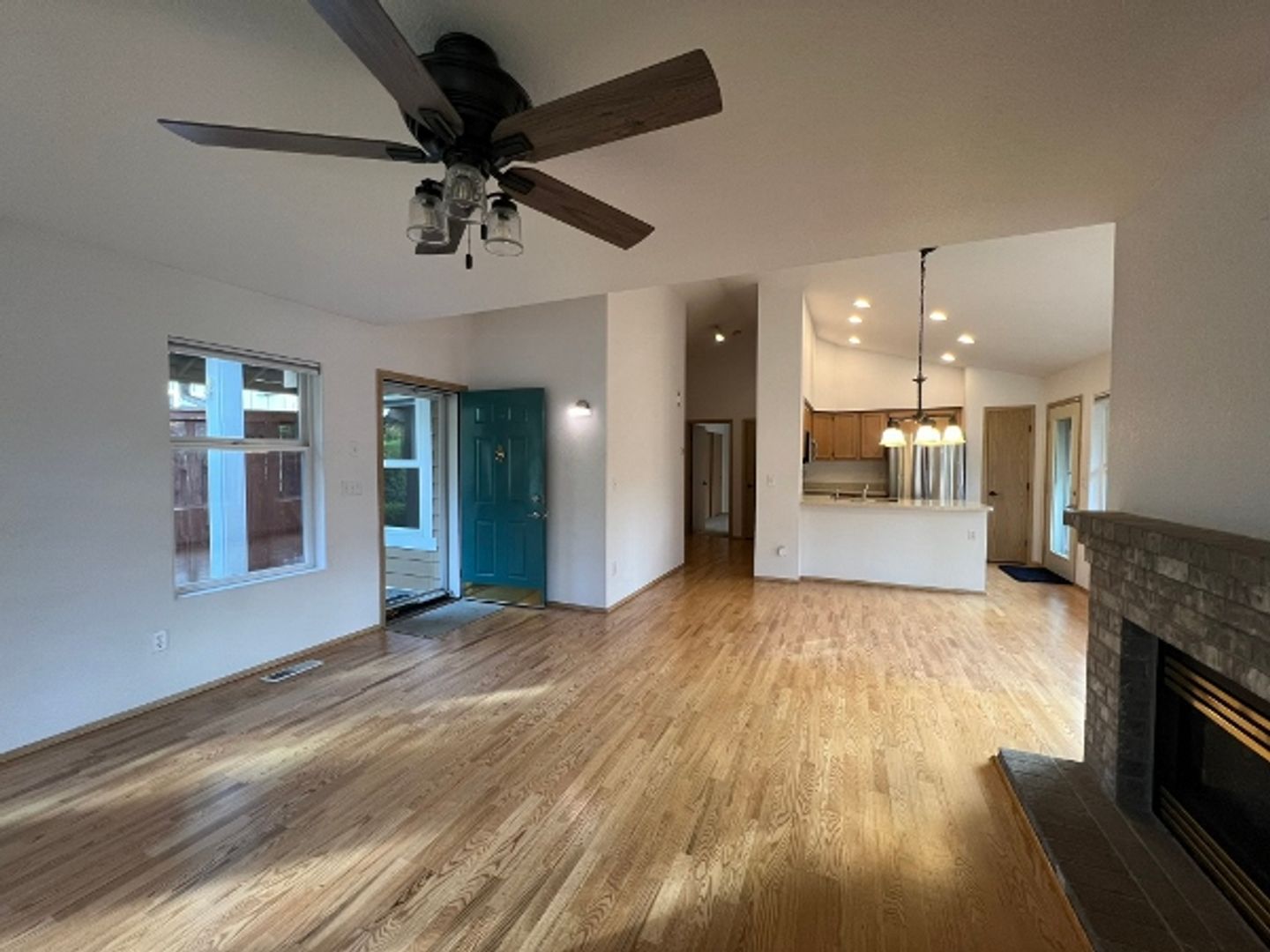 This 2 BD, 2 BA, 1,100 SF rambler is conveniently located near amenities and directly across the street from William A. Bush Park. Open living/kitchen/dining with gas fireplace and many windows. Kitchen appliances include: Refrig, electric range, microwave, and dishwasher. Primary bedroom offers double closets, attached bath, and slider. Additional bedroom and 2nd full bath. Side door and slider lead to fully fenced patio and access to garage. Washer/dryer in garage (appliances included). Attic storage accessible by ladder. Forced air heat and AC. Tenant to maintain all utilities and side yard. HOA maintains front yard. Pets allowed with homeowner approval only.